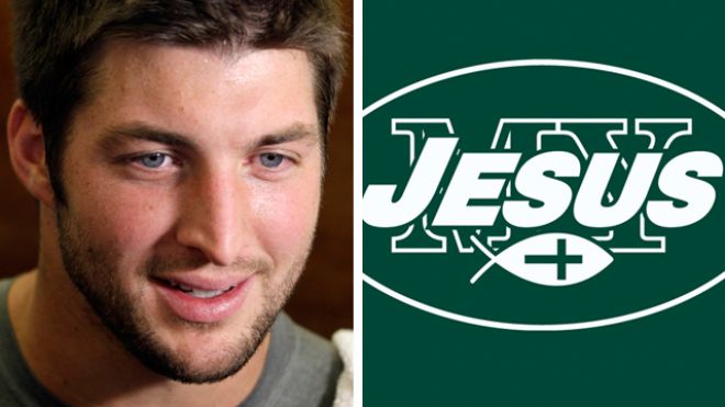 On its website, the company says the T-shirt’s “fun design is not officially endorsed by New York’s backup quarterback or the Son of God, but plays off the themes of Tebow’s faith and his new team — borrowing from the J-E-T-S to promote J-E-S-U-S, with a fish for a football, and “MY” replacing “NY” with a color scheme that will be familiar to Jets fans.”