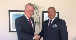 General Overseer Tim Hill, left, congratulates newly-elected Full Gospel Church of God of Southern Africa Moderator Stafford Petersen (click photo to enlarge)