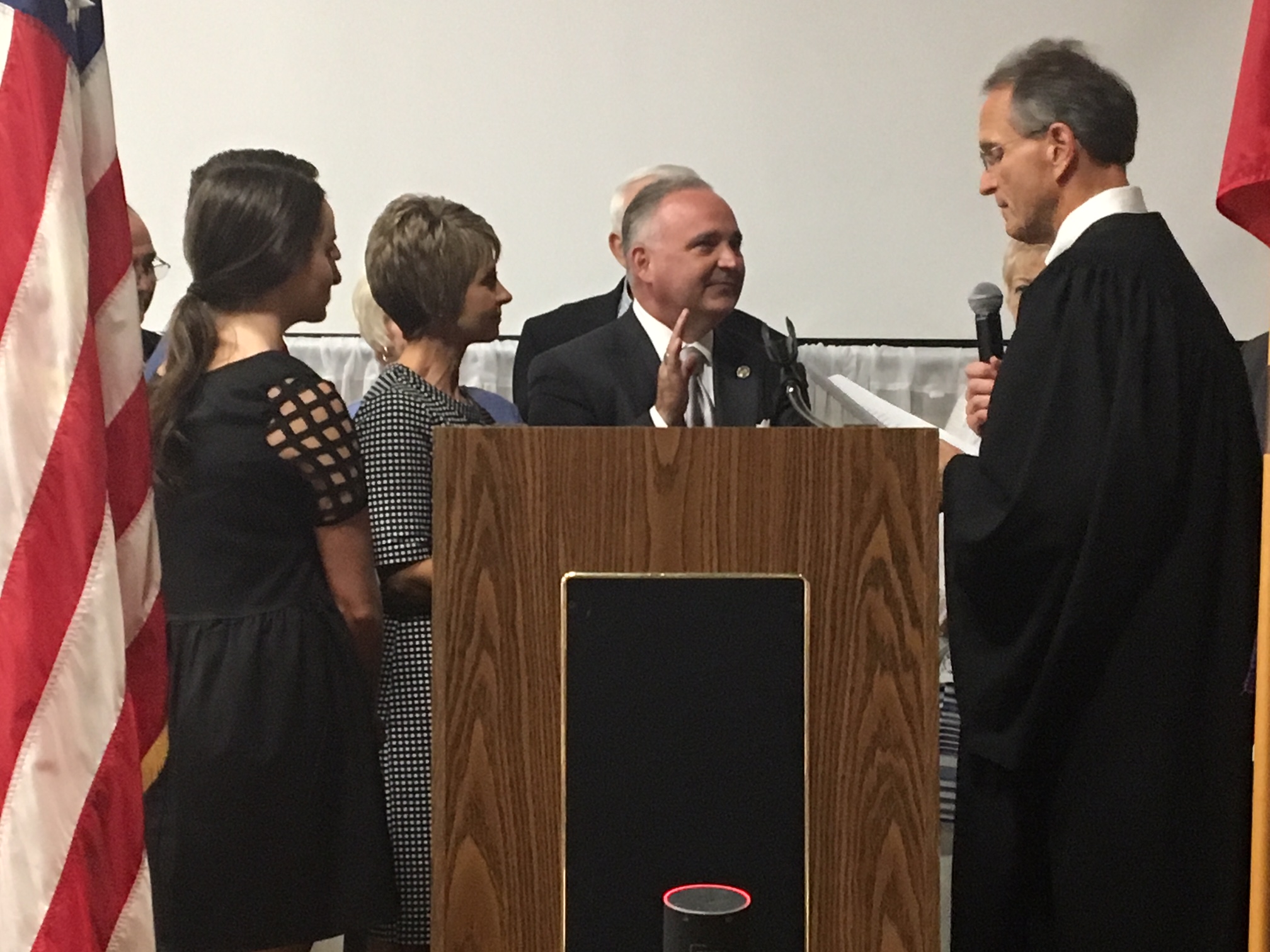 Judge Michael Sharp, right, swears in Kevin Brooks as Brooks’ daughter Elizabeth, left, and wife Kim, look on. (click image to enlarge)