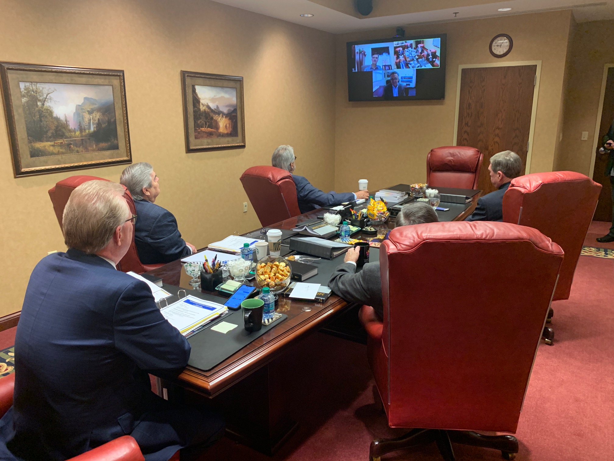 General Overseer Tim Hill, left, is joined by the Executive Committee and via Skype by Mitchell Tolle, and Mitchell Tolle, Jr. on April 2 (click photo to enlarge)