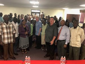 General Overseer Tim Hill (center, blue shirt) is joined by Assistant General Overseer David Ramirez, Secretary General John Childers and Bahamian church leaders (click photo to enlarge)