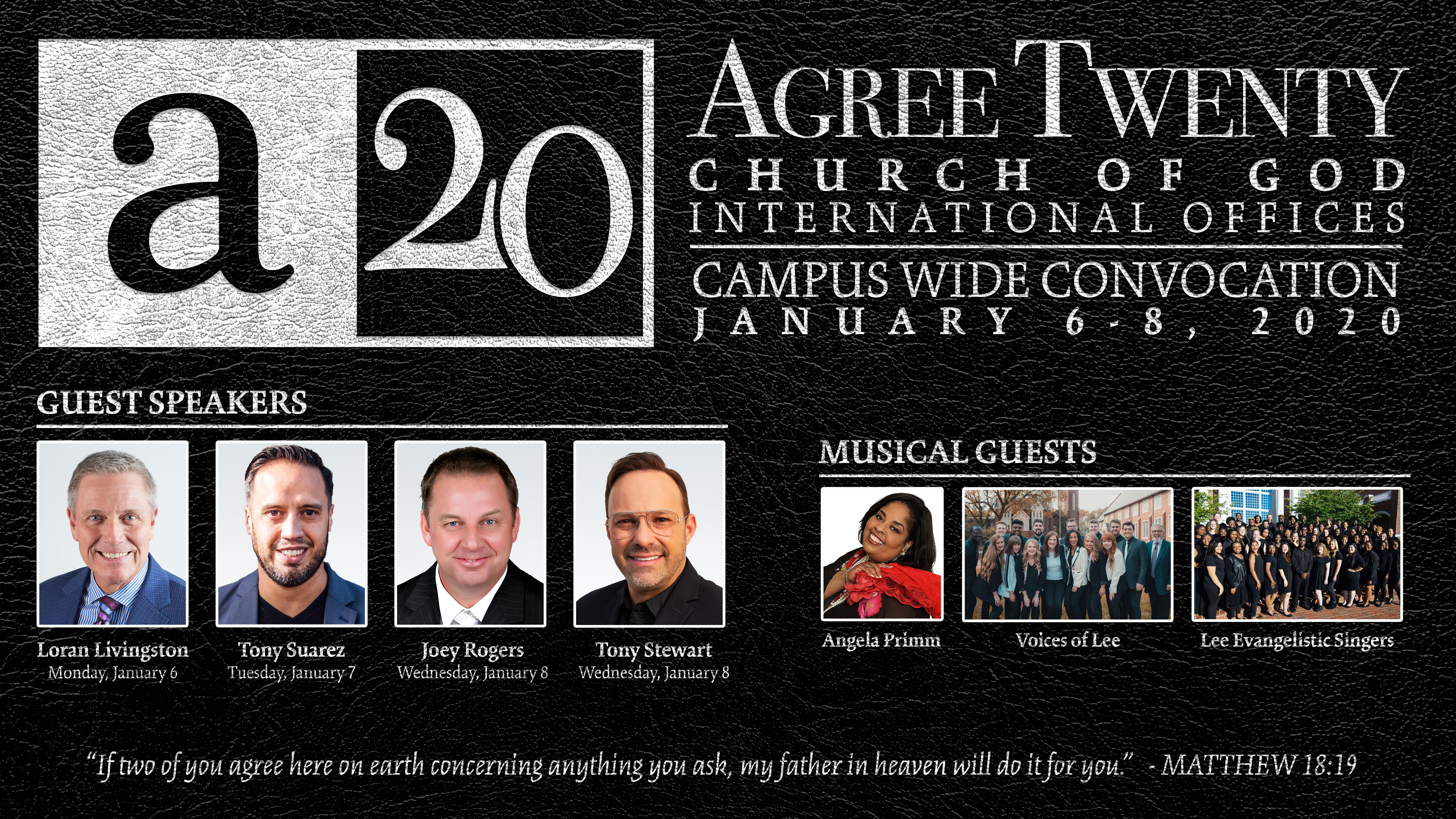 All services are open to the public with limited seating available. Closer to the event, an online link dedicated to Agree ’20 will be unveiled on churchofgod.org. All services will be carried livestream. Information on connecting to the livestream will be posted on the web link.