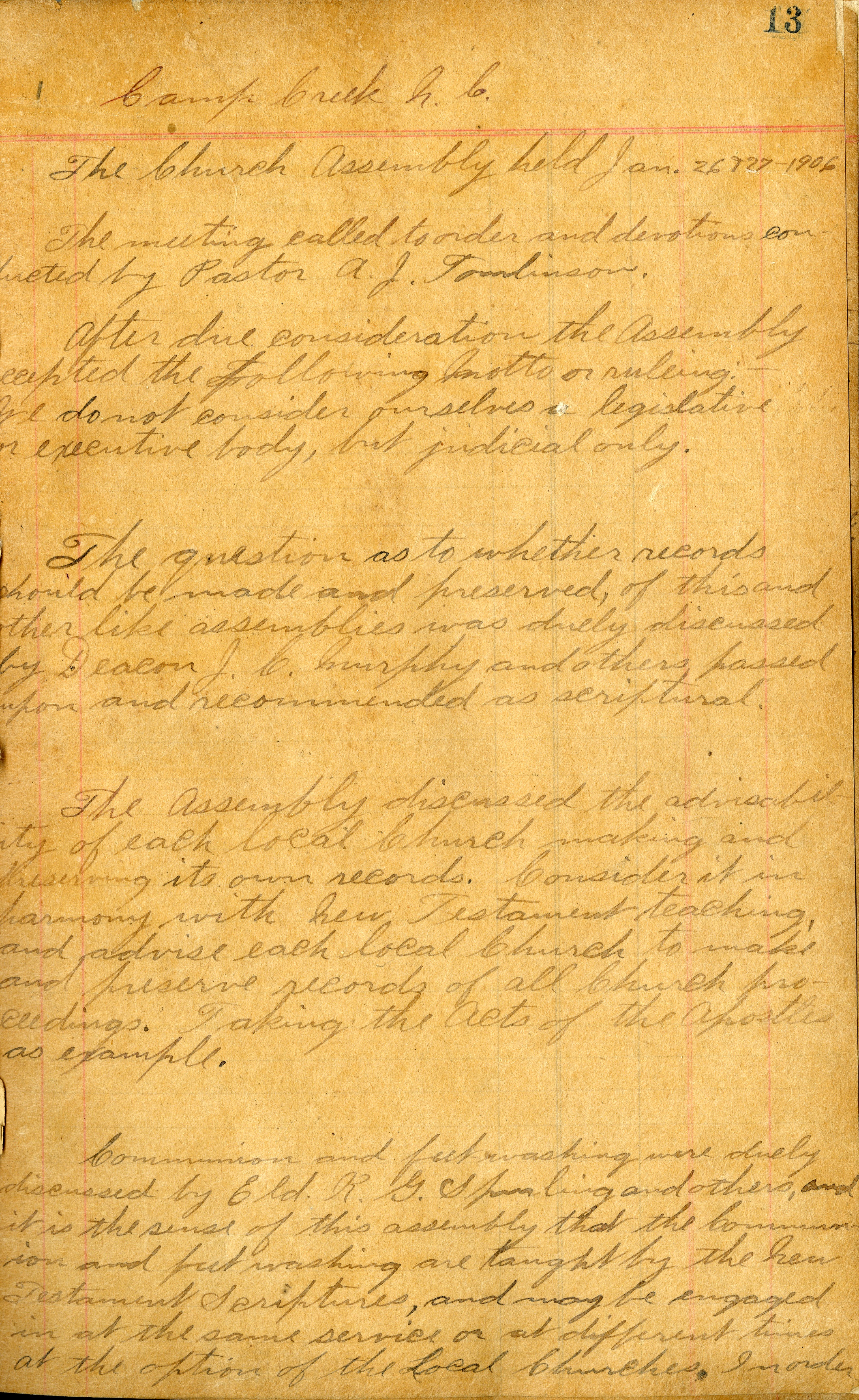 The first Church of God General Assembly met 114 years ago this weekend, January 26-27, 1906, in a private home in the Camp Creek community of North Carolina. Pastor A.J. Tomlinson moderated that Assembly and later printed the minutes of that meeting as a tract. With some exceptions, the General Assembly met annually until 1946 and biennially since that time. Now known as the Church of God Book of Discipline, Church Order, and Governance, the Minutes contain a record of the business conducted at each Assembly as well as a compilation of past decisions that continue determining the doctrine and polity of the church. Having them available online allows anyone to review the historical development of Church of God doctrine, practices, and ministries since the first Assembly.