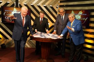 Members of the International Executive Committee pray over the certificates of the MIP graduates (l-r) Tim Hill, J. David Stephens, David E. Ramirez and John D. Childers (click photo to enlarge)