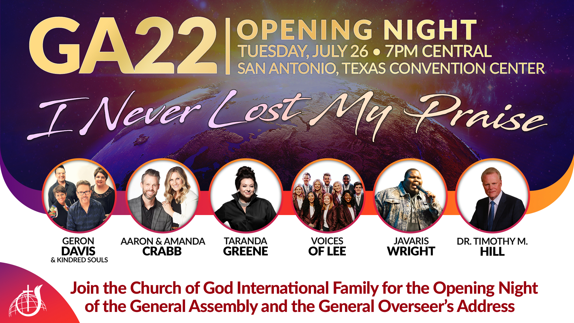 The opening night of the assembly welcomes an exciting group of special guests for a musical celebration, “I Never Lost My Praise!” Taking the stage that night will be Aaron and Amanda Crabb, Geron Davis and Kindred Souls, Taranda Greene, Javaris Wright, and Lee University’s Voices of Lee. General Overseer Tim Hill will close out the evening with a message on the Assembly theme, “The Church on Mission.” The gathering will take place and be broadcast via livestream on Tuesday, July 26 at 7:00 pm Central from the Henry B. Gonzalez Convention Center in San Antonio.